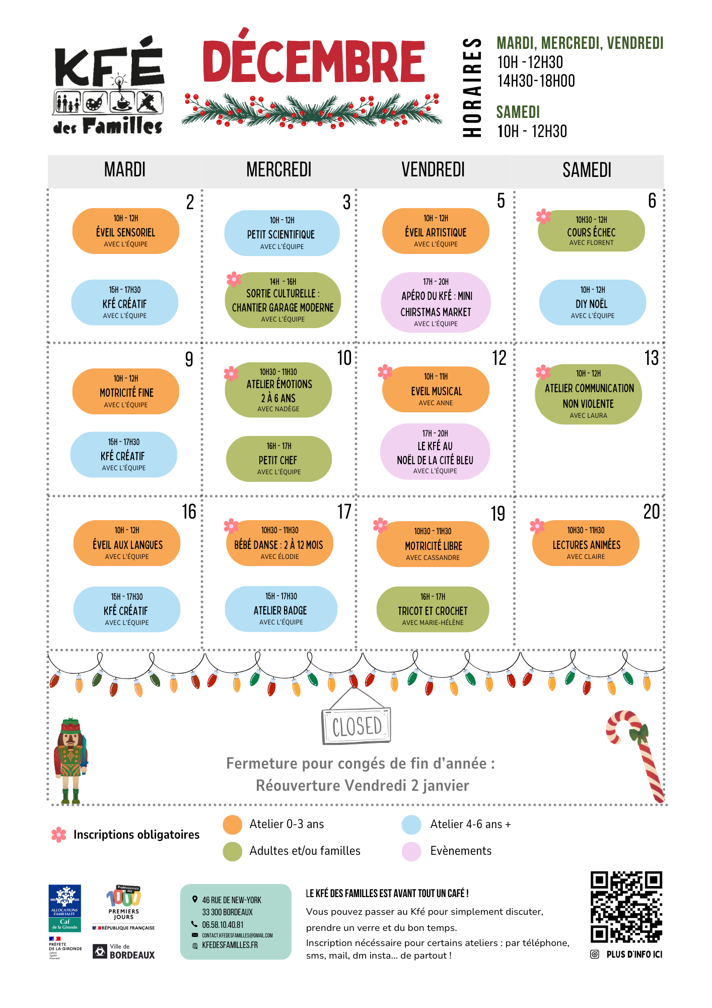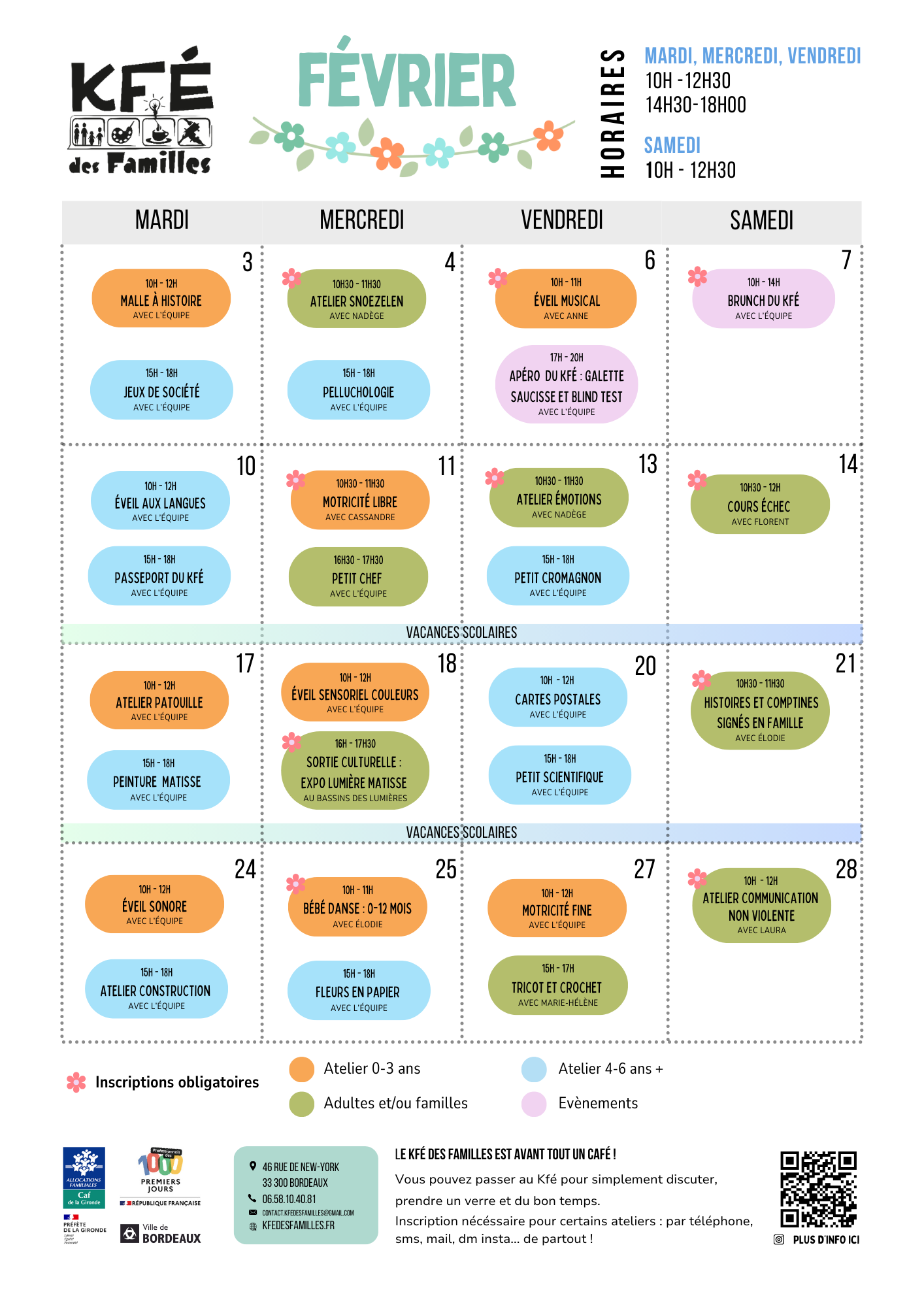 Chaque semaine, des rendez-vous variés et adaptés vous attendent pour partager, apprendre et s’amuser dans un cadre chaleureux et bienveillant.
